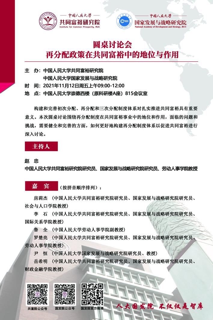 【活动预告】圆桌讨论会——再分配政策在共同富裕中的地位与作用