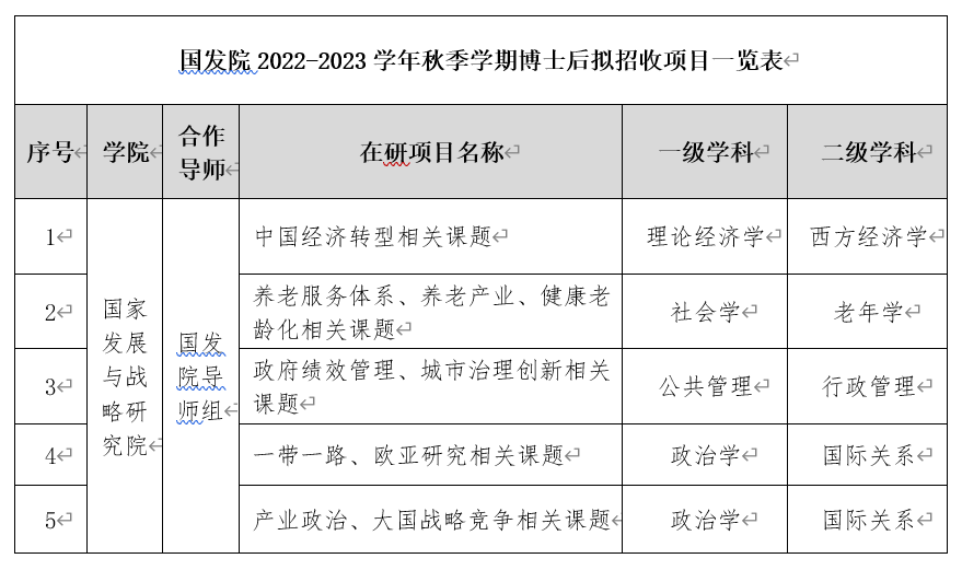 国发院2022-2023学年秋季学期博士后拟招收项目一览表