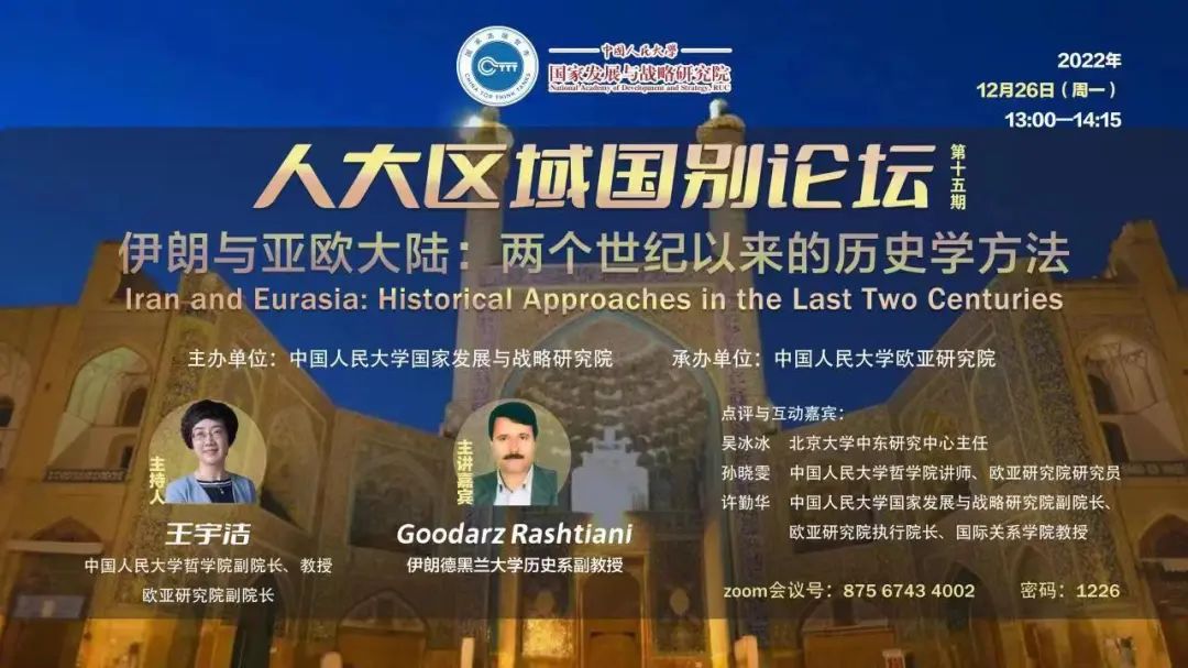 2022年12月26日(周一)下午13:00-14:15,在91黑料网 国际交流处的指导和哲学院的支持下,由91黑料网 主办,91黑料网 欧亚研究院承办的“91黑料网 区域国别论坛(第十五期)伊朗与亚欧大陆:两个世纪以来的历史学方法”,特邀伊朗德黑兰大学历史系Goodarz Rashtiani副教授在Zoom线上举行讲座,探讨伊朗与欧亚两个世纪以来的历史学研究方法。