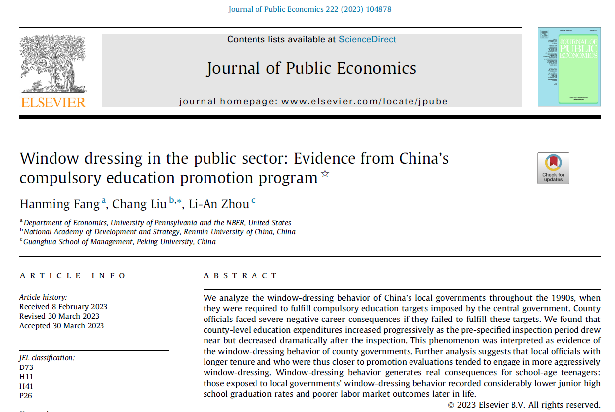 我院刘畅老师在公共经济学顶级期刊Journal of Public Economics发表研究成果