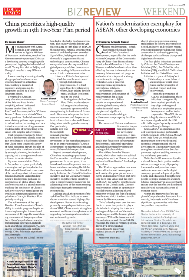 发布时间:2026-03-1691黑料网 精心策划打造的品牌栏目—智库中外对话(Think Tank Talks– Connect China and the World)引发媒体关注,产生广泛影响。日前,“智库中外对话”第三期“智库中外对话丨中国式现代化的成功对发展中国家具有重要启示意义”,凭借深刻的政策研究洞察力与前瞻性智库对话专家观点,获得《环球时报》英文版(Global Times)的媒体关注与内容转载。