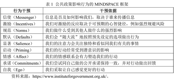英国政府研究院(Institute for Government)在2010年就提出了MINDSPACE的分析框架,认为可以从信使(Messenger)、激励(Incentives)、规范(Norms)、默认(Defaults)、显著(Salience)、启动(Priming)、情感(Affect)、承诺(Commitments)、自我(Ego)这九个方面设计公共政策去改变人的行为(如表1所示)。