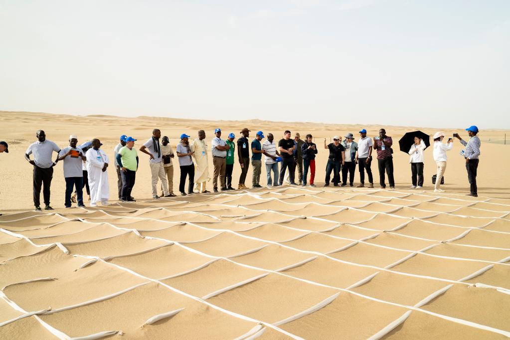 2023年6月12日,在塔克拉玛干沙漠机械防沙示范区,非洲和中亚学员参观固沙新技术。图/周生斌
