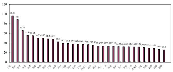 (7)在清白指数方面,排名前10名的城市是:北京、温州、潍坊、鞍山、广州、台州、聊城、杭州、石家庄、成都。东部沿海城市的清白指数明显高于内陆地区。按省份比较,北京、上海和浙江位居前三,青海、河南和西藏排列末位。从经济水平来看,省内清白指数差异与经济发展水平之间不是线性关系。