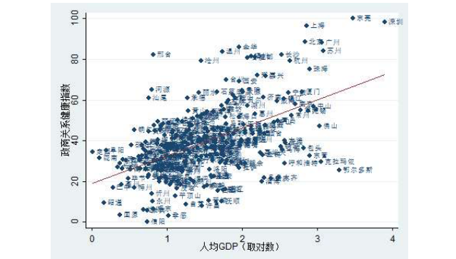 一个有趣的问题是,政商关系越是健康的地方,是不是经济水平越高的地方?事实基本如此。我们利用Stata软件做了一个二维散点图(图3)。在图3中,横轴是表示收入的人均GDP对数,纵轴是各城市的政商关系健康指数。拟合线的位置表明,政商关系健康指数与人均GDP呈现显著的正相关关系(r=0.53,p<0.01)。这一规律与前面的区域分析和级别分析基本一致。这说明,一个地方通过发展经济,可以改善营商环境;反过来,改善了营商环境,又推动了经济发展。经济发展和营商环境是互为因果的。
