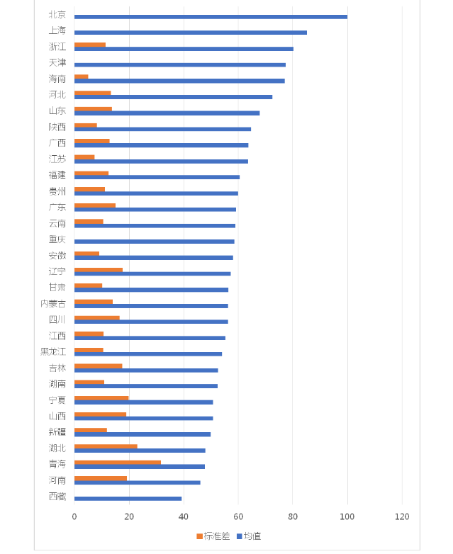 (2)按省份来看,北京、上海和浙江位居前三,青海、河南和西藏排列末位。与亲近指数排名相比,前两名类似,但后几名均不相同,这也说明亲近和清白是有差异的。图10提供了各省样本城市清白指数得分均值以及省内标准差。北京排名最高(100分),其次是上海市(85.09)。浙江省各个城市的均值为80.24,名列各省首位,然后是天津市(77.28)、海南(77.01)、河北(72.52)、山东(67.9)、陕西(64.67)、广西(63.69)和江苏(63.51)。在前20名中,浙江省有4个城市进入;在20-50名中,浙江省有6个城市进入,远高于其他省份。