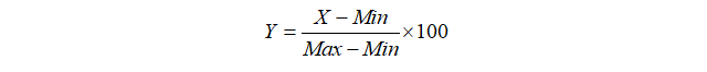 为便于解读,对于总指数和分项指数均进行了正常化处理,即使用如下公式进行转换。其中,X为初始值,Min和Max分别为该指标的最小值和最大值,Y为最终值。据此获得的指数得分介于0分到100分之间。