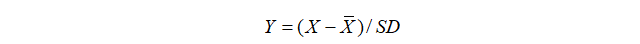 第二步,对所有三级指标进行标准化,使其成为均值为0和方差为1的标准化指标。处理公式如下。其中,X为初始值,为样本均值,SD为样本标准差。