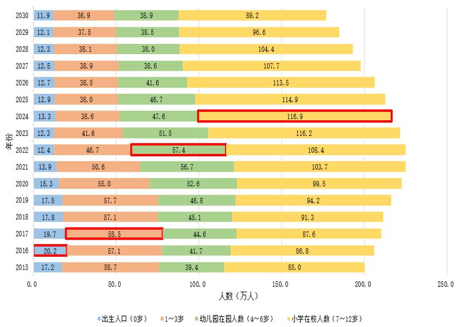 数据显示,北京市幼儿园在园人数在2022年达到57.4万的峰值后,2024年已降至47.6万,预计到2030年可能进一步降至约39万。与此同时,小学在校生人数在2024年达到了约117万的历史峰值后也已经进入下降通道,预计到2030年可能减少至约89万。