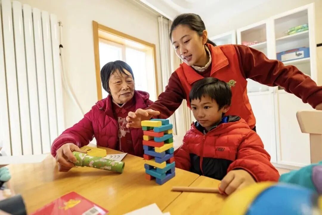 社区活动空间开辟老幼共融区,老人和小孩共同参与益智类活动。图源:北京西城民政