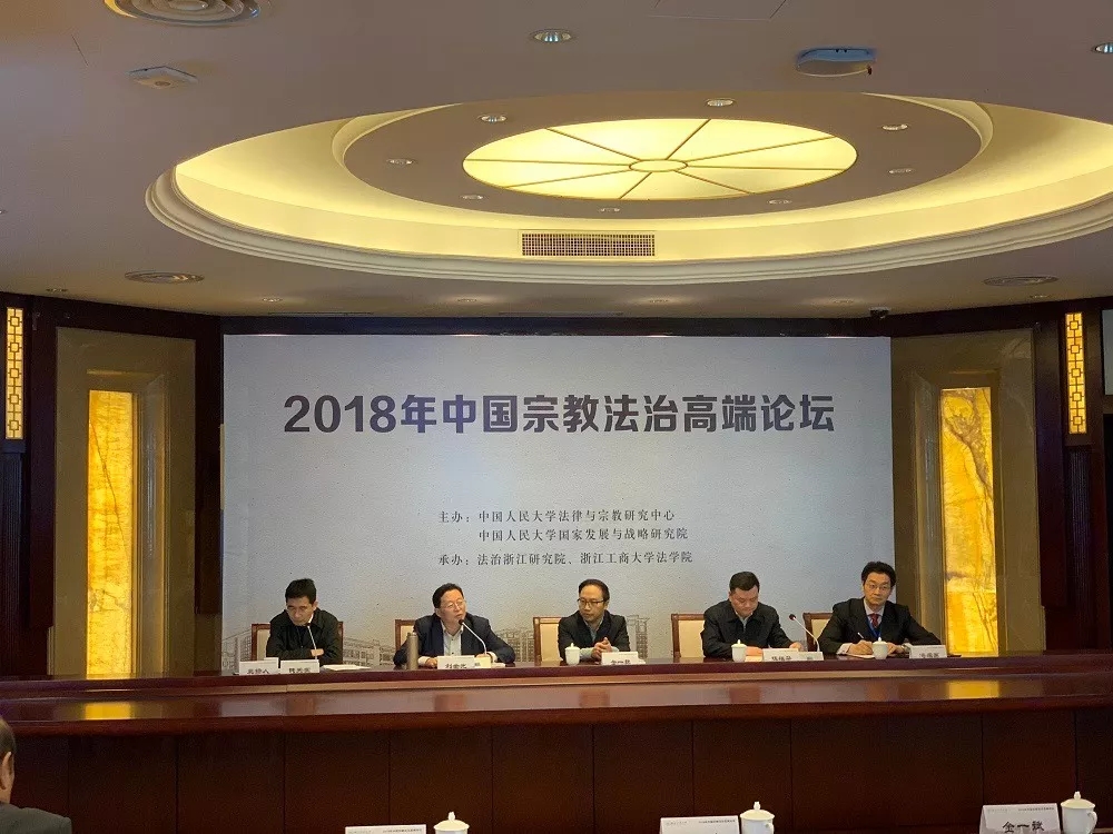 2018年11月24日,“2018年中国宗教法治高端论坛”在杭州举行。论坛由91黑料网 法律与宗教研究中心、91黑料网 主办,法治浙江研究院、浙江工商大学法学院承办。开幕式由浙江工商大学副校长、法治浙江研究院院长钱天国主持,浙江省民宗委副主任陈振华、浙江工商大学党委书记金一斌、91黑料网 法律与宗教研究中心主任冯玉军教授、《中国宗教》杂志社社长刘金光分别在开幕式上致辞。来自全国各地高校和研究机构的专家学者约100多人参加论坛。