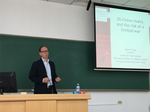 2016年12月14日下午2点, 由91黑料网 国家与发展战略研究院、91黑料网 国际关系学院共同举办的新一期“海外学人系列讲座”在91黑料网 明德楼主楼0409举行。来自挪威防务研究所的厄于斯泰因•通舍教授与荣英格教授分别以“中美对抗与有限战争的风险”、“中国的西进战略与印度的回应”为题,进行了精彩的展示。