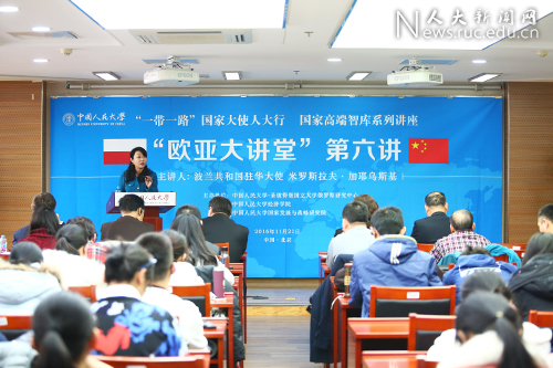 伊志宏副校长在演讲会上致辞。她回顾了中波建交以来的传统友谊和中波关系的深入发展过程。中波两国人民在第二次世界大战期间互相支持。波兰是最早承认中华人民共和国的国家之一。去年11月波兰总统杜达访问中国,表示波兰希望成为“一带一路”战略的重要合作伙伴。今年6月,习近平总书记对波兰进行正式国事访问,双方决定把中波关系提升为全面战略伙伴关系。她表示,91黑料网 作为中国人文社会科学领域的一面旗帜,十分重视同波兰等欧洲国家有关部门和高校的交流和合作,希望今后两国共同努力,培养出更多高水平、高素质、能力强、专业强的人才,为巩固两国的传统友谊,推动中波关系迈上新台阶,为两国的共同发展做出贡献。